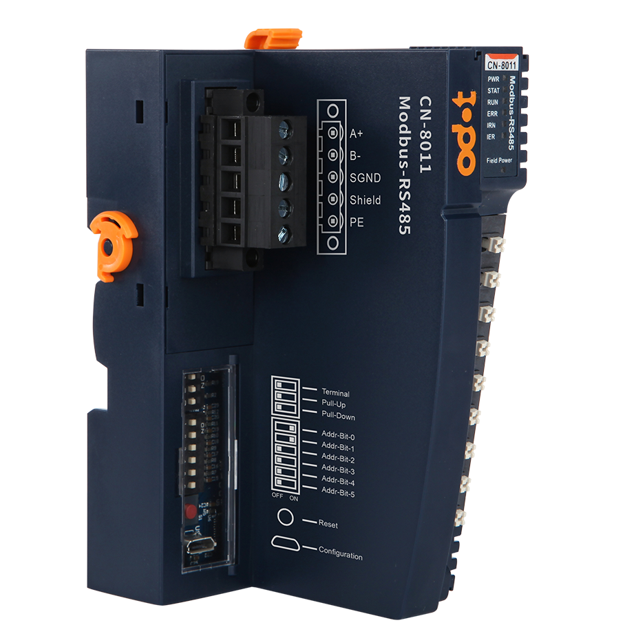 Modbus-RTU网络适配器支持标准Modbus-RTU通讯,支持01/02/03/04/05/06/15/16号功能码,可实时监控IO模块通信状态。